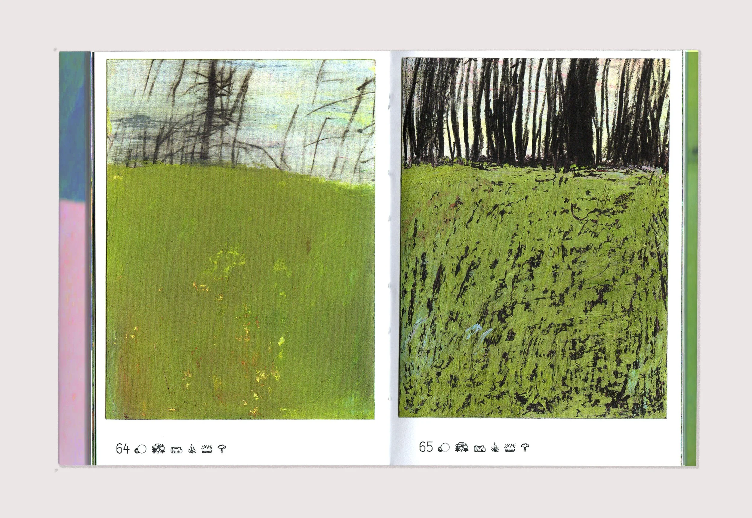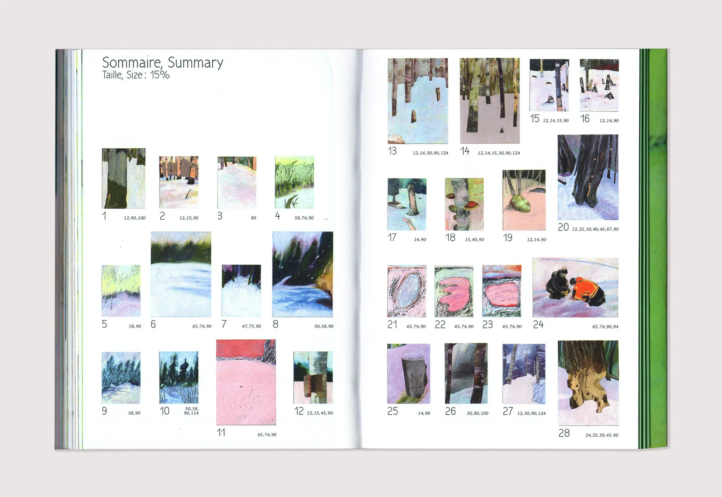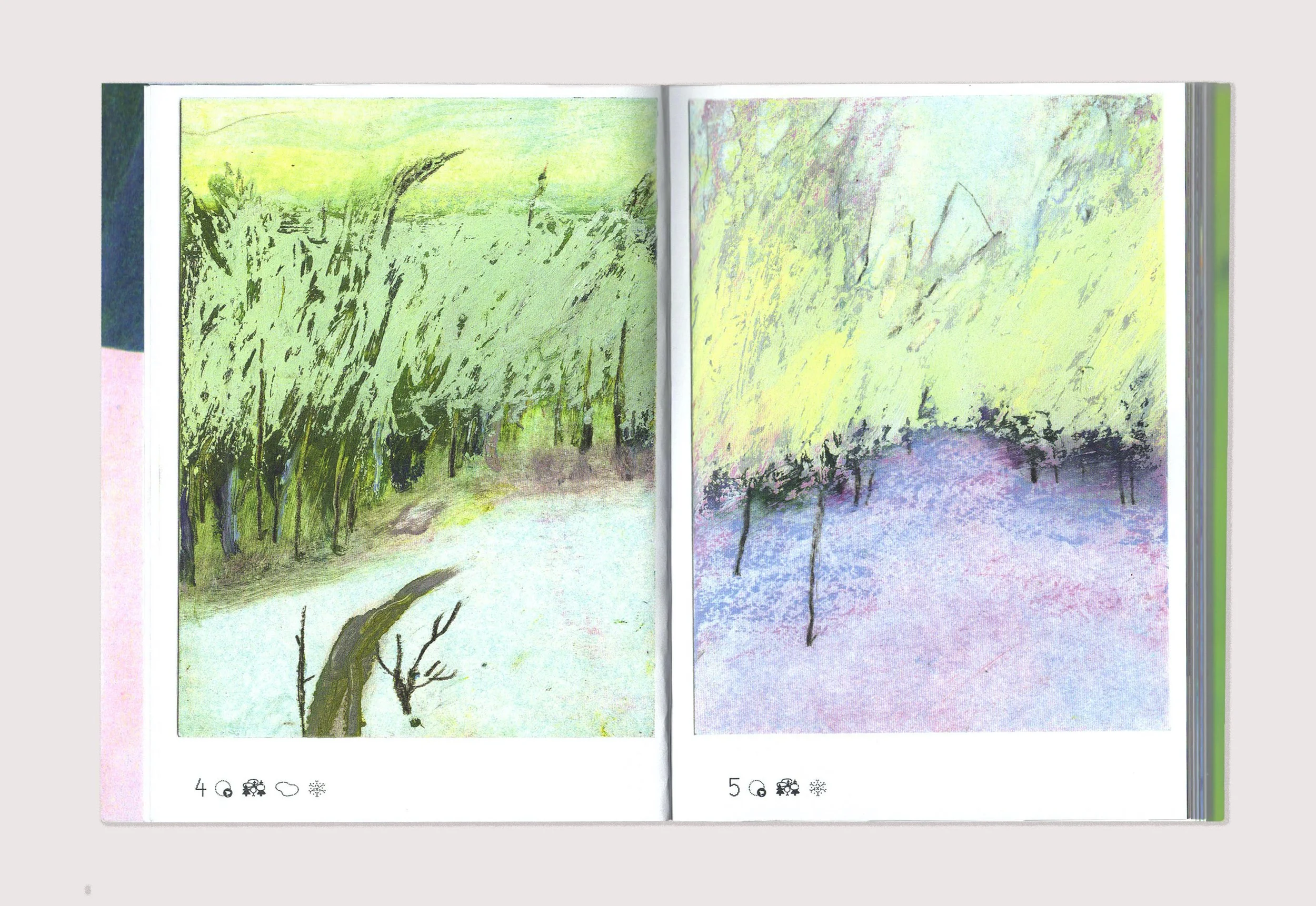 Petit Bois recreates an immersive experience in Quebec's boreal forest. In 2024, I spent two months at a forest ecology research station located in the heart of the forest, where I accompanied a team of scientists in the field. The book features ninety-two oil pastels, created in winter and summer. At the end of the book, a set of words—scientific concepts, observed elements, studies conducted, sensations experienced—are defined from three points of view: that of a paleoecology researcher, that of a female land guardian who is a member of the Innu First Nation, and my own. Self-published, 212 pages, 2025. Available at the Librairie sans-titre. (FR) Petit Bois restitue une expérience d’immersion dans la forêt boréale québécoise. En 2024, je passe deux mois dans une station de recherche en écologie forestière située au cœur de la forêt où j’accompagne une équipe de scientifiques sur le terrain. Le livre présente quatre-vingt douze pastels à l’huile, réalisés en hiver et en été. À la fin de l’ouvrage, un ensemble de mots – notions scientifiques, éléments observés, études menées, sensations éprouvées – sont définis selon trois points de vue : celui d’un chercheur en paléoécologie, celui d’une femme gardienne de territoire membre de la Première Nation Innu, et le mien. Auto-publication de 212 pages, 2025. Disponible à la Librairie sans-titre.