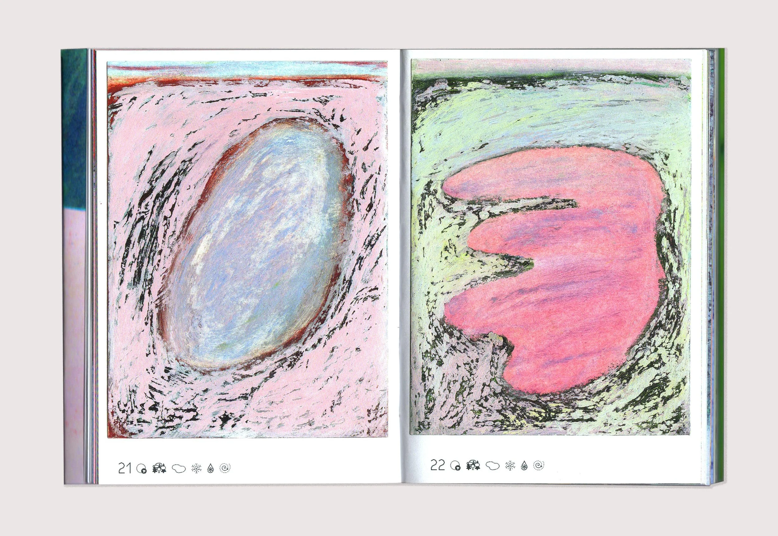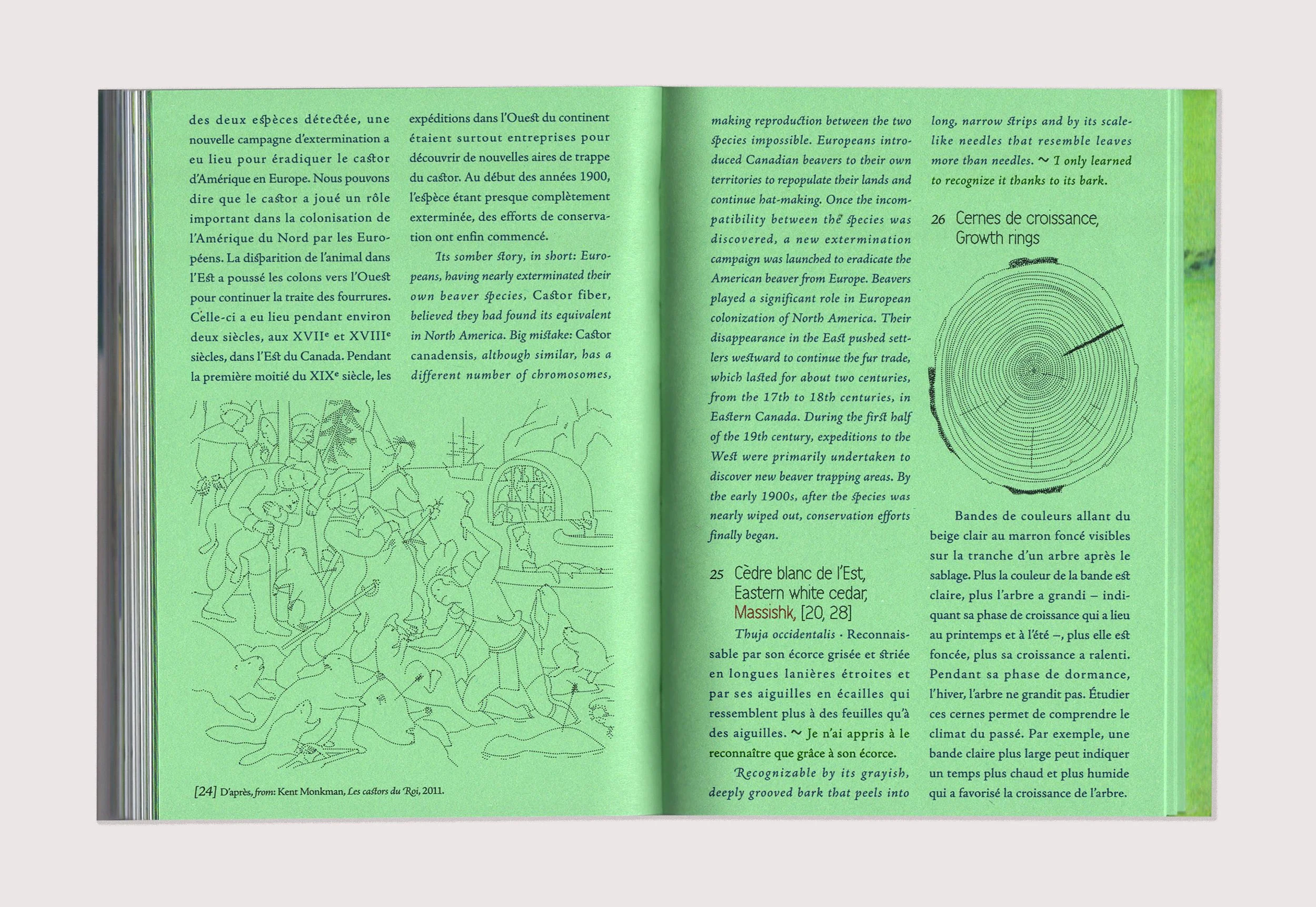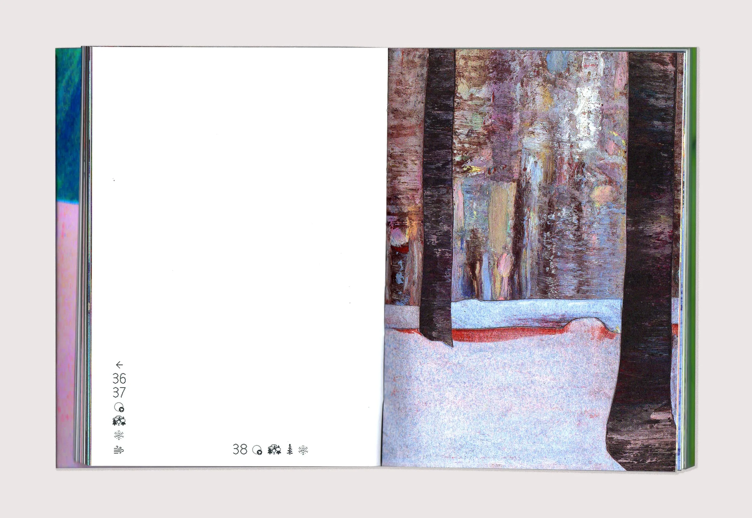 Petit Bois recreates an immersive experience in Quebec's boreal forest. In 2024, I spent two months at a forest ecology research station located in the heart of the forest, where I accompanied a team of scientists in the field. The book features ninety-two oil pastels, created in winter and summer. At the end of the book, a set of words—scientific concepts, observed elements, studies conducted, sensations experienced—are defined from three points of view: that of a paleoecology researcher, that of a female land guardian who is a member of the Innu First Nation, and my own. Self-published, 212 pages, 2025. Available at the Librairie sans-titre. (FR) Petit Bois restitue une expérience d’immersion dans la forêt boréale québécoise. En 2024, je passe deux mois dans une station de recherche en écologie forestière située au cœur de la forêt où j’accompagne une équipe de scientifiques sur le terrain. Le livre présente quatre-vingt douze pastels à l’huile, réalisés en hiver et en été. À la fin de l’ouvrage, un ensemble de mots – notions scientifiques, éléments observés, études menées, sensations éprouvées – sont définis selon trois points de vue : celui d’un chercheur en paléoécologie, celui d’une femme gardienne de territoire membre de la Première Nation Innu, et le mien. Auto-publication de 212 pages, 2025. Disponible à la Librairie sans-titre.